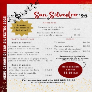 « Tutti gli Eventi Menu San Silvestro 2025 Dicembre 31 « Menu Natale 2025 Salva nel tuo calendario Google Calendar iCalendar Outlook 365 Outlook Live Dettagli Data: Dicembre 31 Categoria Evento: Events Sito web: www.osterianando.ch Organizzatore Reji & Shobiga Phone 0918255562 Email info@osterianando.ch Visualizza il sito dell'Organizzatore Luogo Grotto osteria del Nando Via Galbisio 3 Bellinzona, 6503 Svizzera + Google Maps Phone 091 825 55 62 Visualizza il sito del Luogo